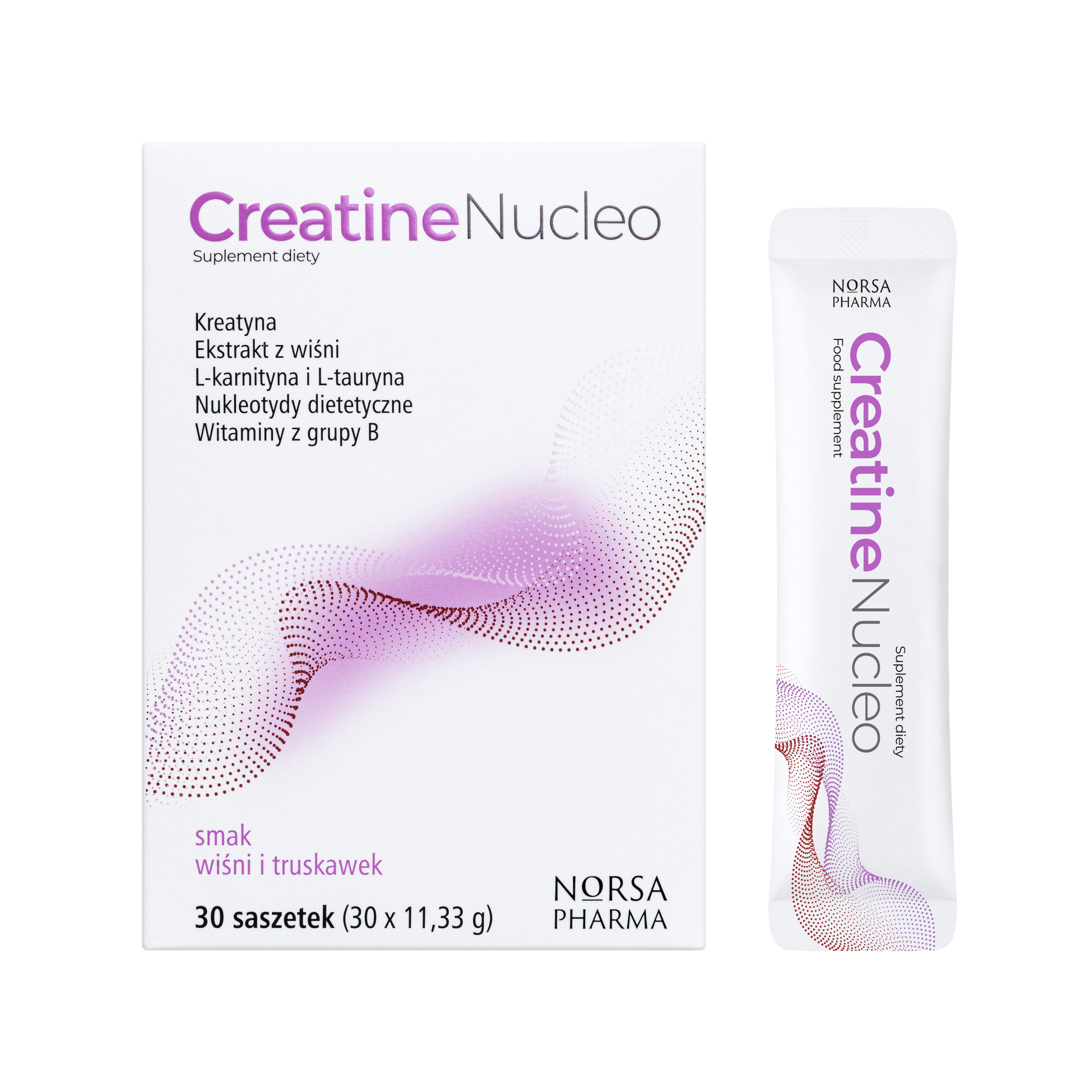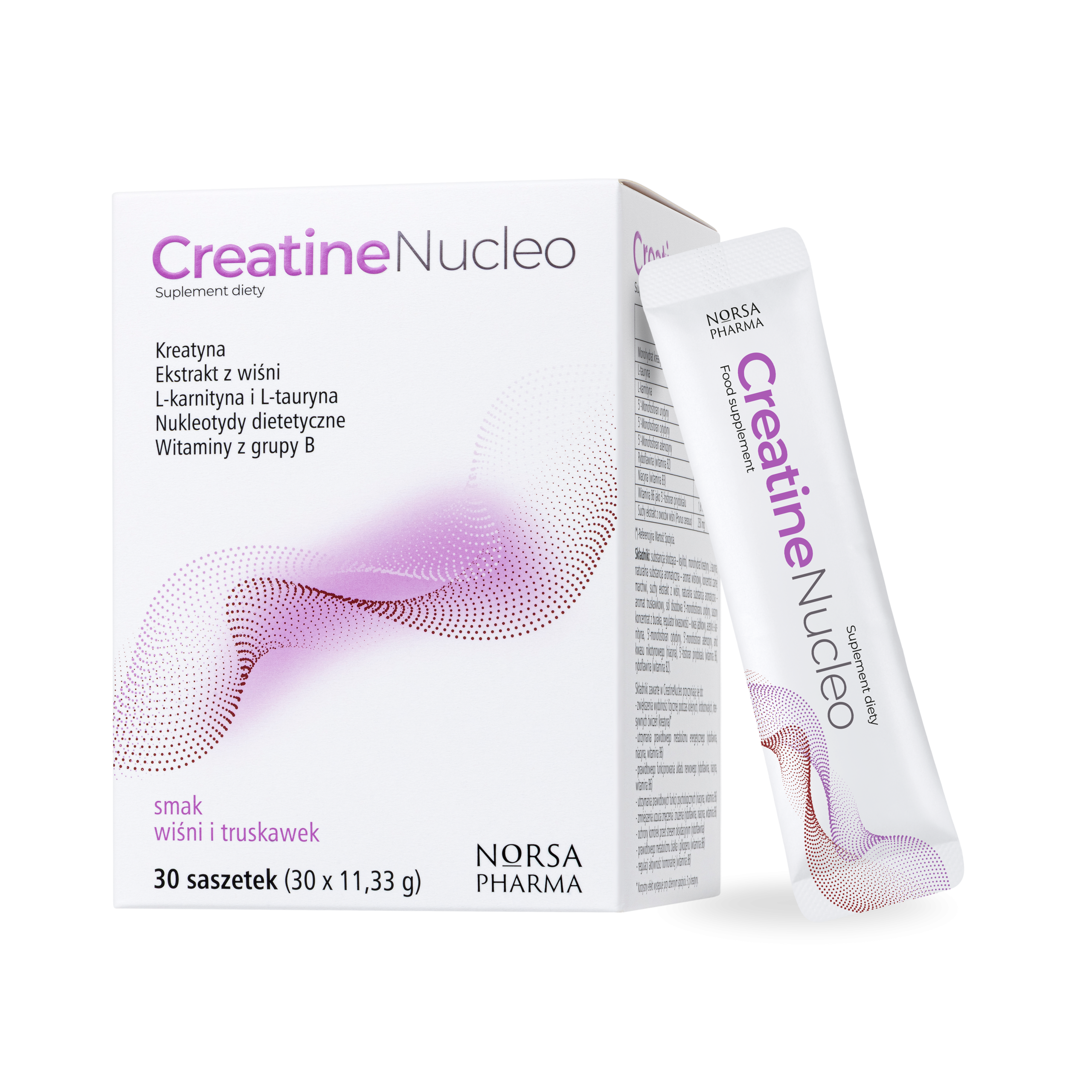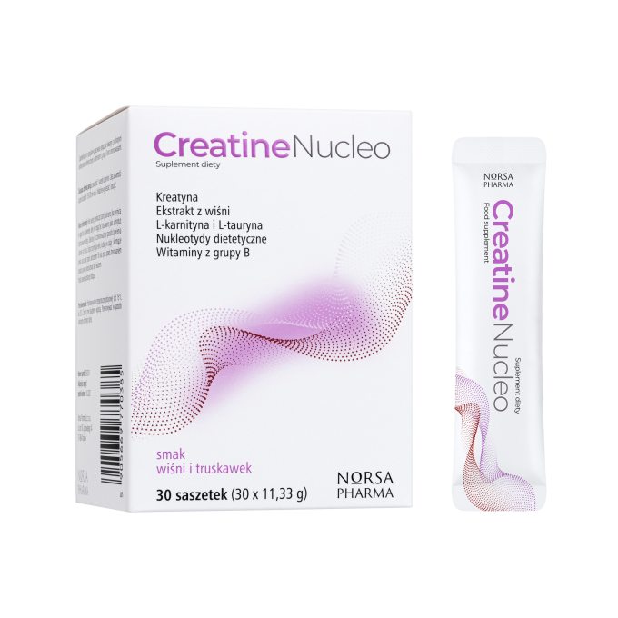 Creatine Nucleo to specjalnie opracowane połączenie kreatyny o bardzo wysokiej rozpuszczalności z zestawem trzech czystych nukleotydów dietetycznych, naturalnym ekstraktem z owoców wiśni, wyselekcjonowanymi witaminami z grupy B oraz ważnymi aminokwasami wspierającymi, takimi jak L-tauryna i acetylo-L-karnityna.
